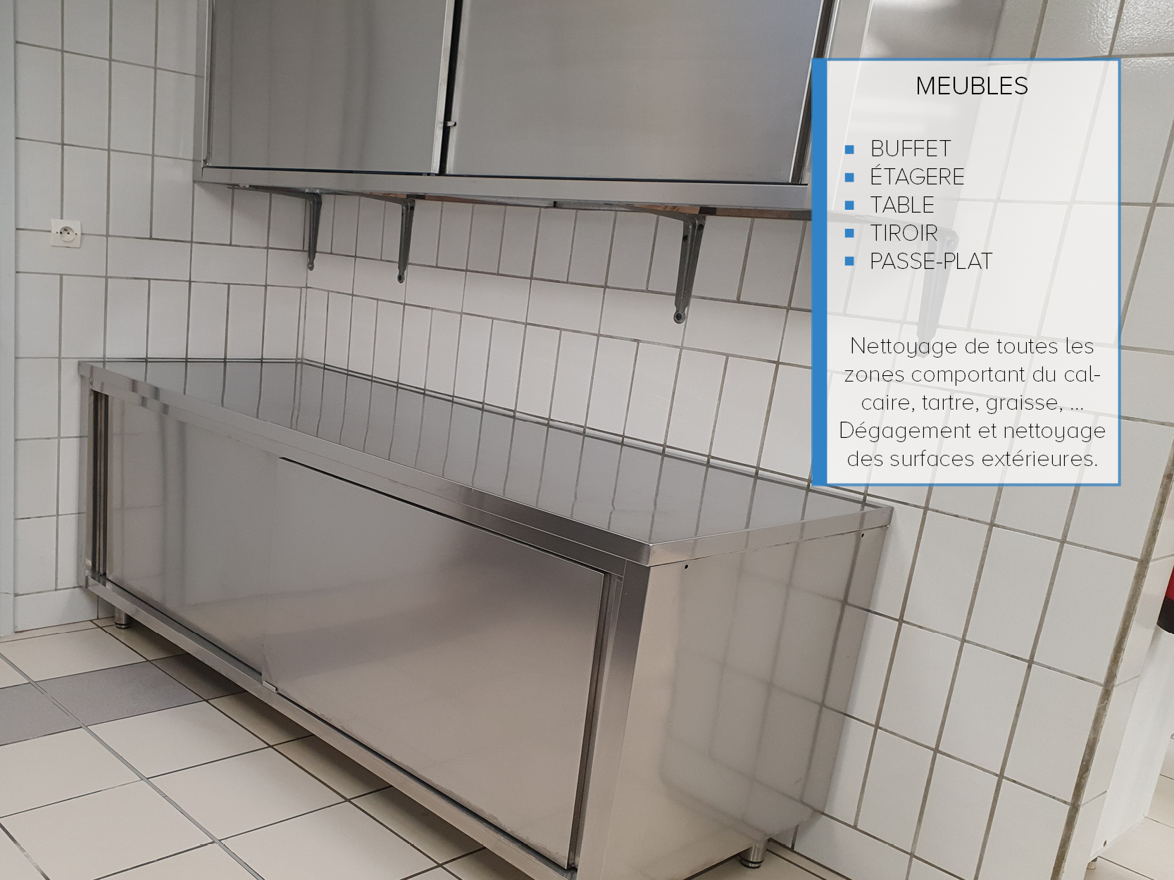 Après avoir déplacé et/ou démonté le mobilier, nos équipes procèdent au nettoyage complet des sols, murs, plafonds, appareils de cuisson et réfrigérants. Ensuite, les éléments sont remontés et de nouveaux joints d’étanchéité sont posés.